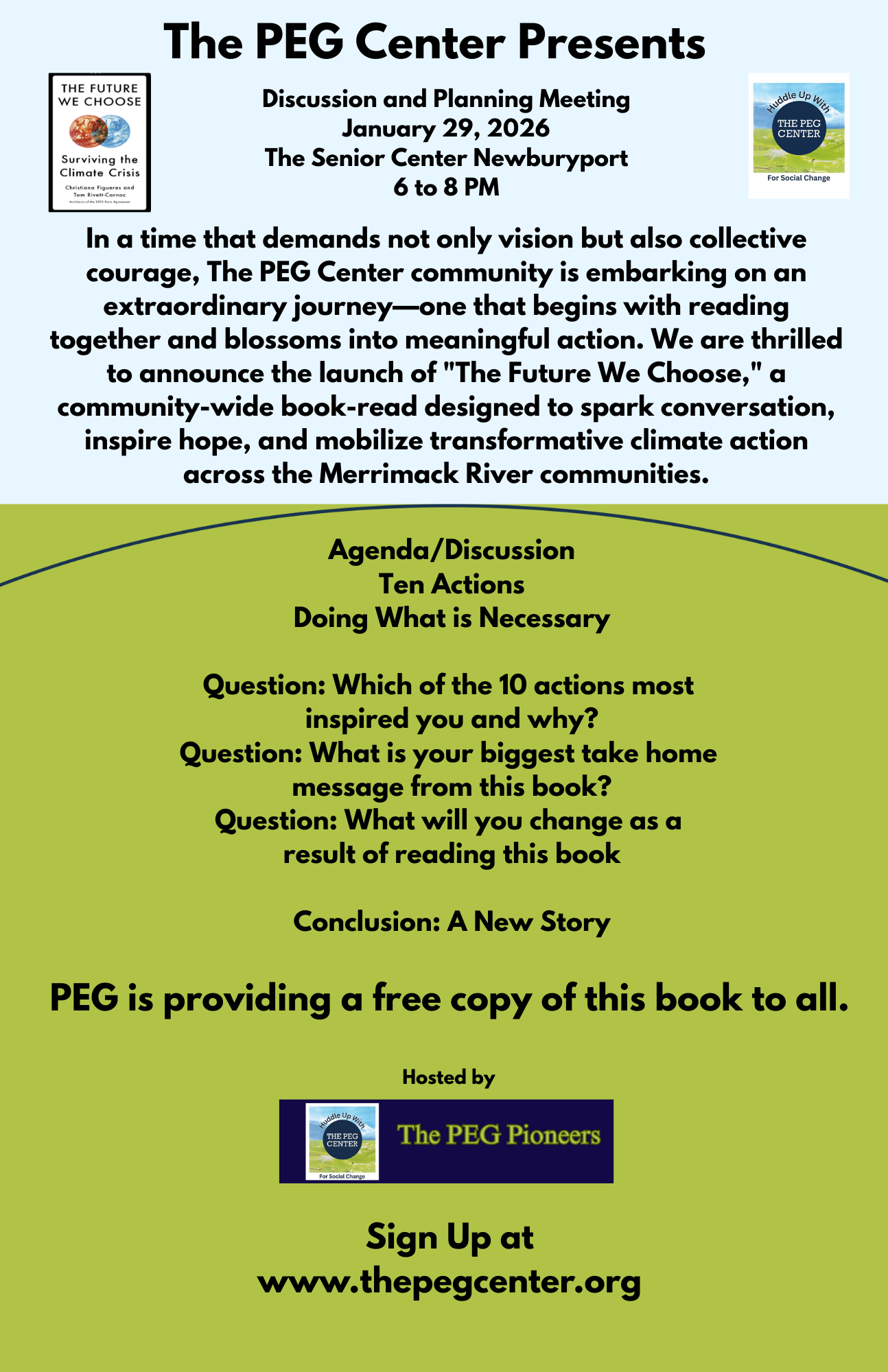 In a time that demands not only vision but also collective courage, The PEG Center/Huddle community is embarking on an extraordinary journey—one that begins with reading together and blossoms into meaningful action. We are thrilled to announce the launch of "The Future We Choose," a community-wide book-read designed to spark conversation, inspire hope, and mobilize transformative climate action across the Merrimack River communities.